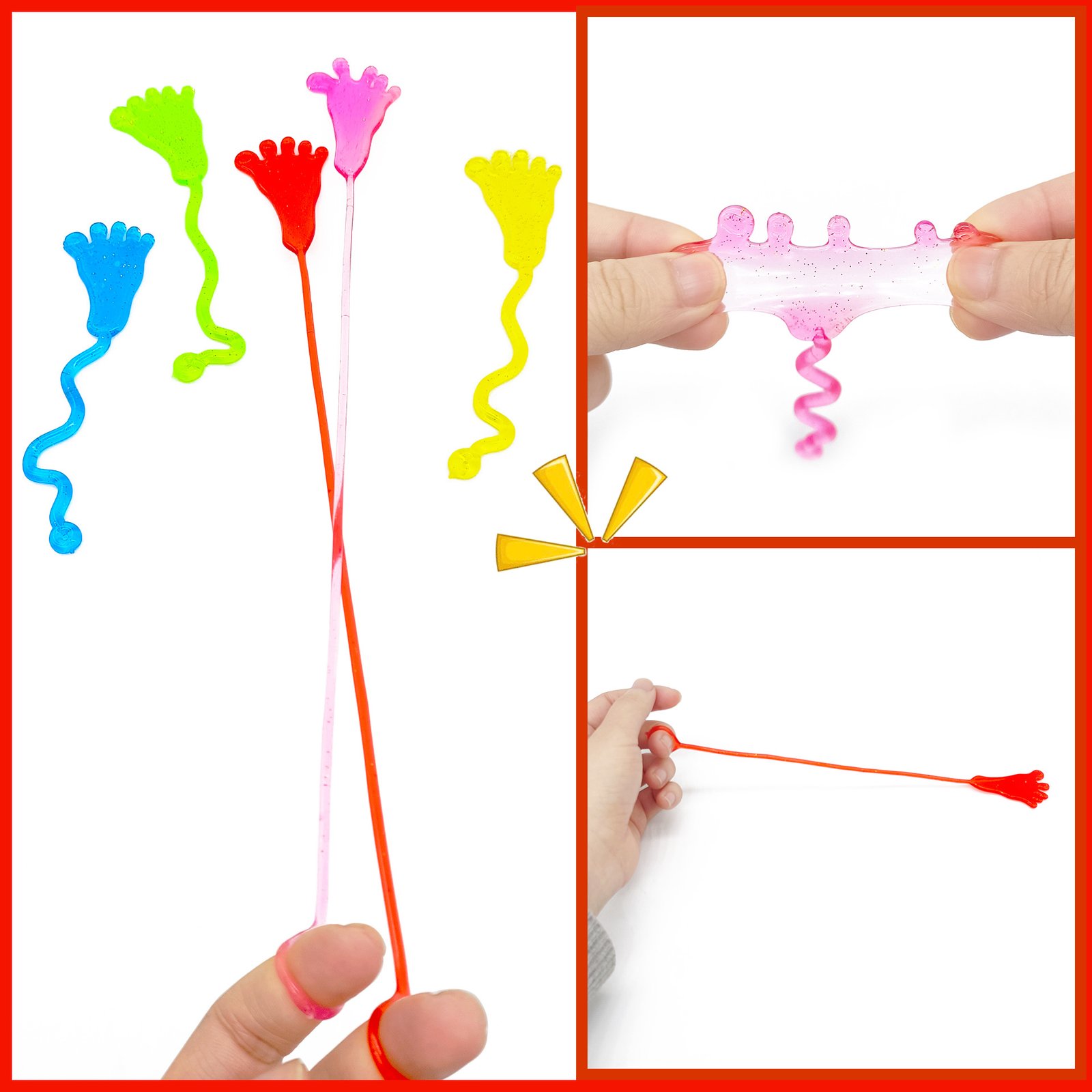 Experience endless fun with these classic sticky hand toys! These colorful, stretchy hands provide hours of entertainment while helping to relieve stress and improve focus through satisfying tactile play.